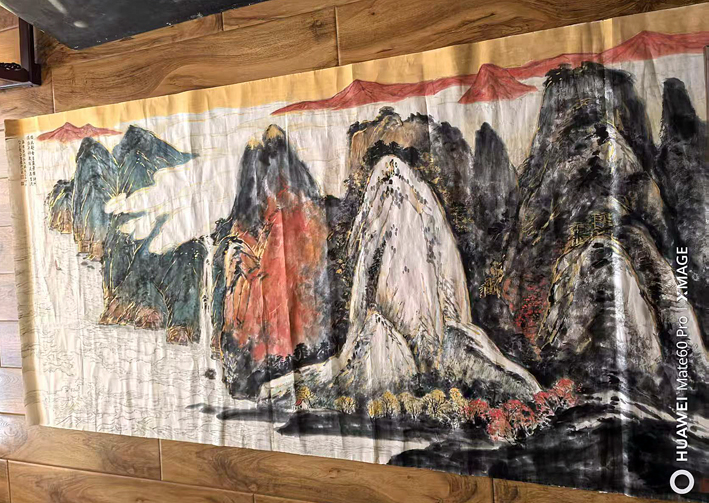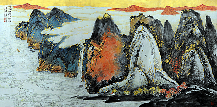 他可以放笔作巨幅长卷,游刃有余,绝无枯竭之感,也可以笔作寸缣尺牍,而得千里之势。他可以泼墨大写,气势磅礴抒情,也可以重彩工笔,金碧辉煌造势。既可以使墨如彩,也可以使彩如墨。既可以千笔万笔不觉其多,也可以三笔两笔不觉其少。他是真真地继承了师尊:“一手伸向传统,一手伸向自然和生活。”的成功的山水名家、大家。